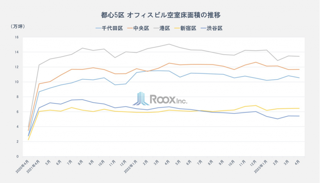 かつては全体の97%以上が埋まっていた東京主要部のオフィスビルですが、コロナ禍以降は千代田区・中央区・港区を中心に、空室率は高止まりの状況です。